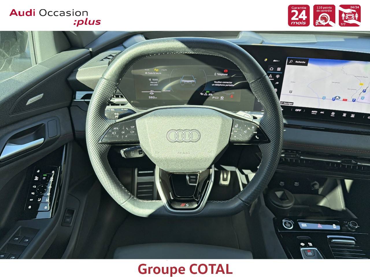 Pack intérieur S line 1 Touches accentuées et touches de commande Noir Brillant, Sièges Sport à l'AV, Pédalier et repose-pieds en acier inoxydable, Appui lombaire 4 voies pour les sièges AV, Applications décoratives en aluminium mat Brossé Foncé, Volant avec application en style chrome avec emblème S, Ciel de pavillon en tissu Noir, Partie supérieure du tableau de bord en Noir avec couture contrastée, Enjoliveurs de seuil de porte avec inserts en aluminium à l'AV, éclairés, monogramme S