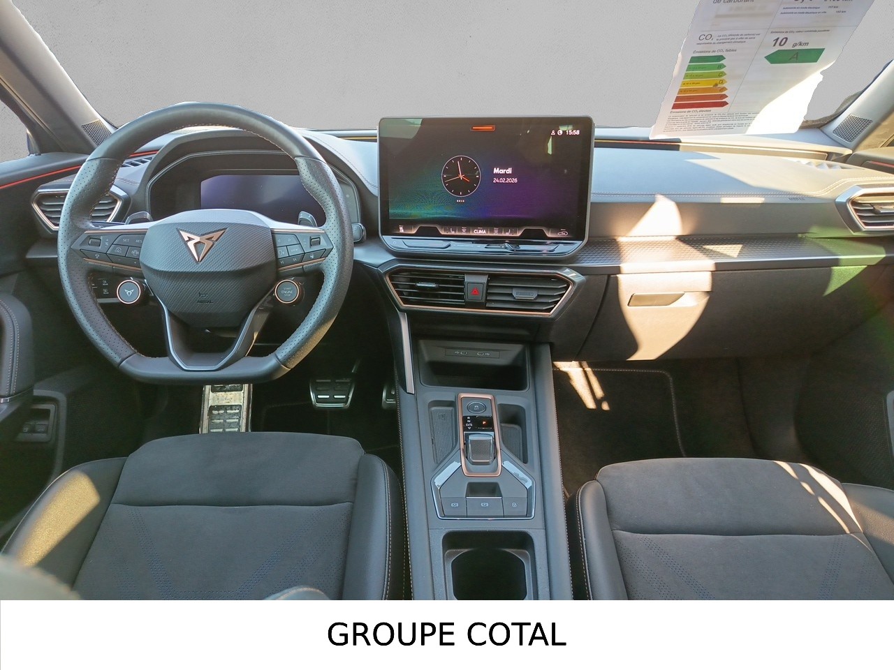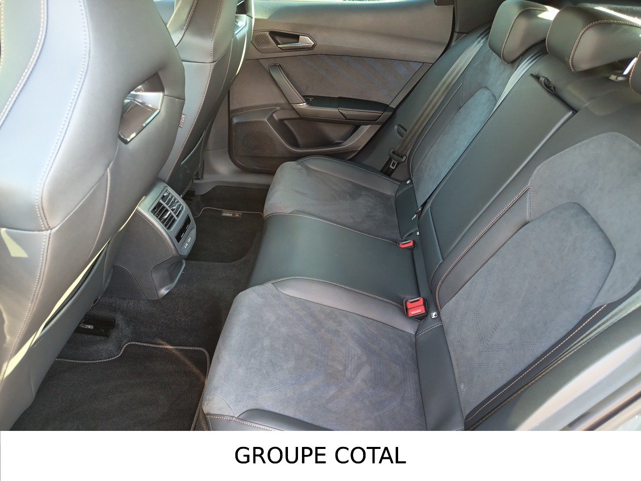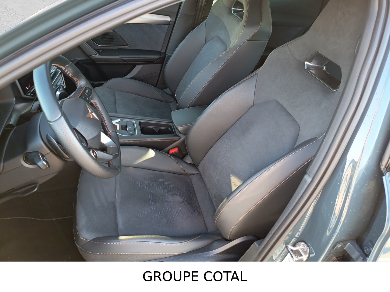 Design intérieur Dynamic - Sièges baquets suédine Noir Asphalte avec poinçonnage Bleu Astral et surpiqûres cuivrées - Logos CUPRA estampés sur les appuie-têtes - Planche de bord noire surpiquée avec inserts Dark Alu - Contre-portes suédine noire avec poinçonnage Bleu Astral - Siège conducteur : chauffant avec réglage électrique à mémoire, y compris réglage lombaire - Siège passager : chauffant avec réglage manuel de la hauteur